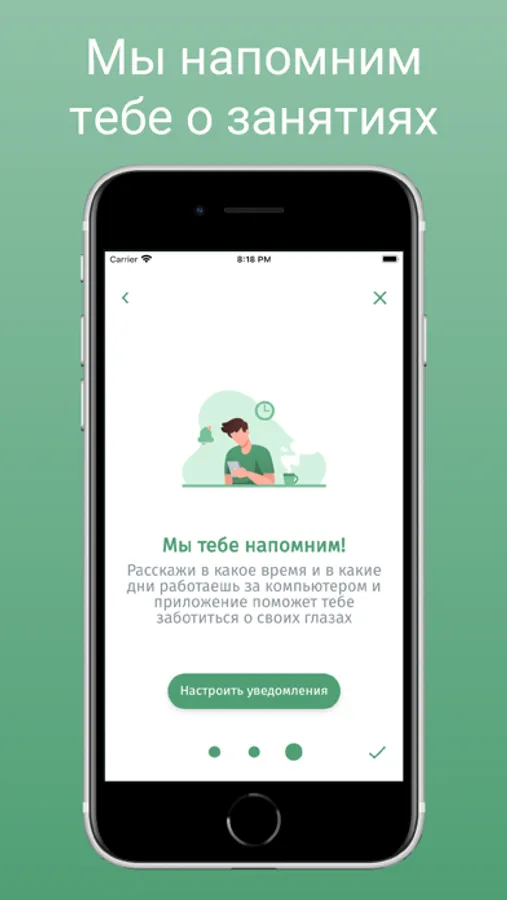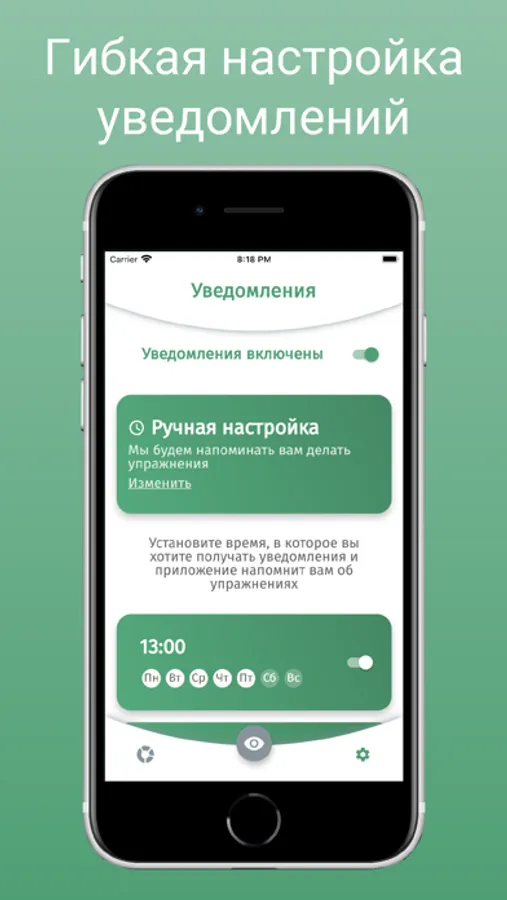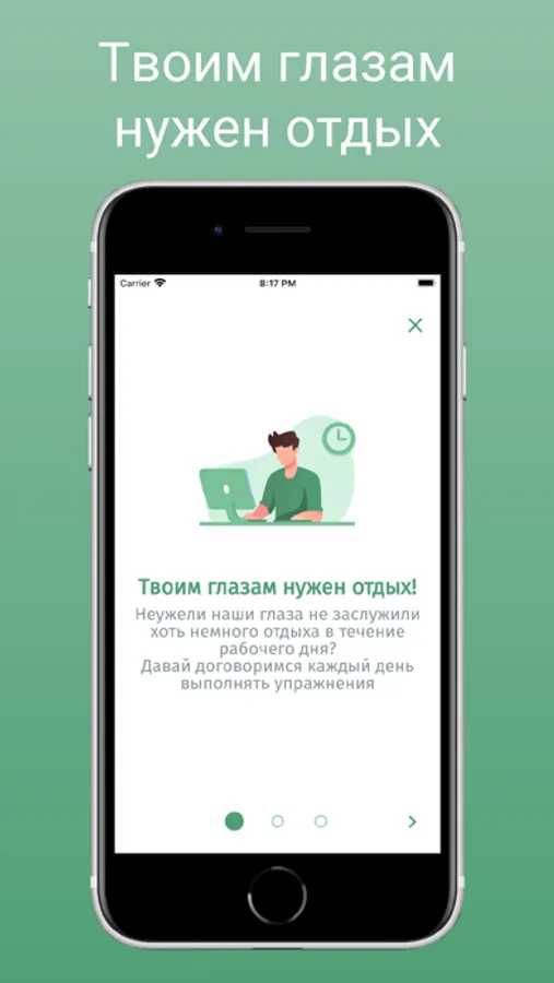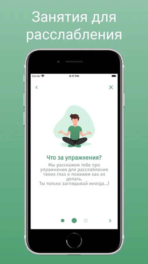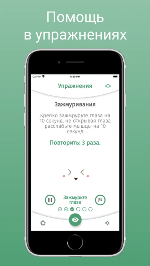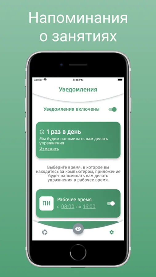 Приложение предназначено для помощи в упражнениях для расслабления глаз и восстановления зрения. Приложение будет напоминать делать упражнение в течение рабочего дня или в заданное пользователем время дня.