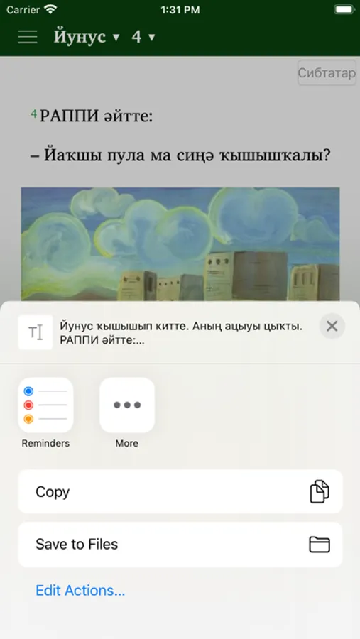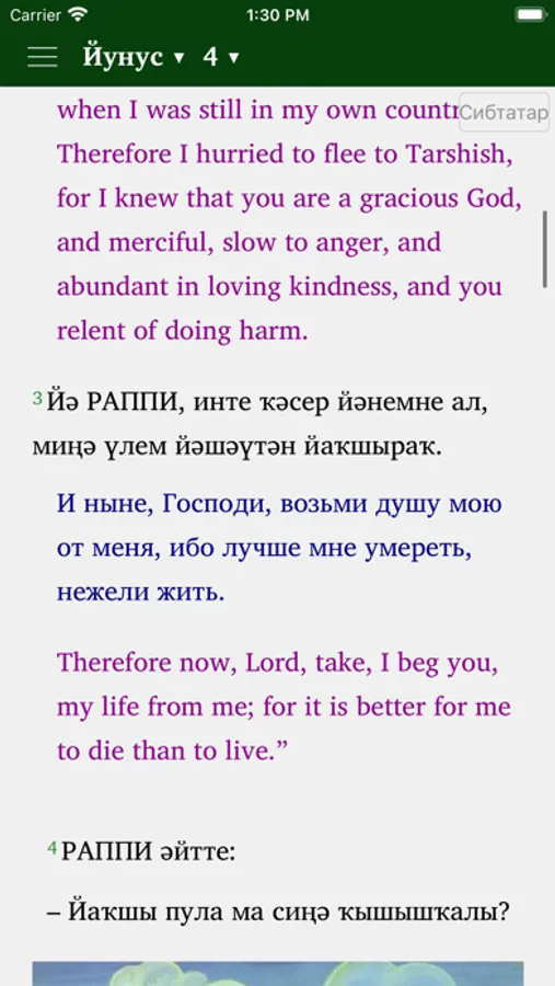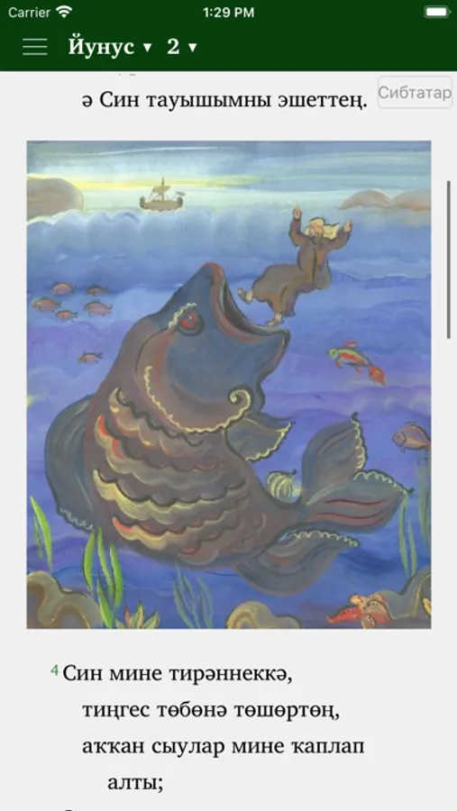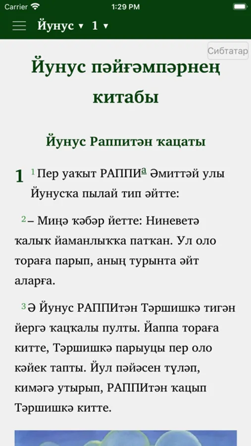 This Scripture Jonah app facilitates Bible study in the Siberian Tatar language. It includes the translation of one of the books of the Old Testament - the book of the prophet Jonah. The translation was carried out by a group of specialists in the fields of biblical studies and linguistics from the Institute for Bible Translation in Tobolsk and Moscow.