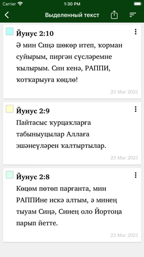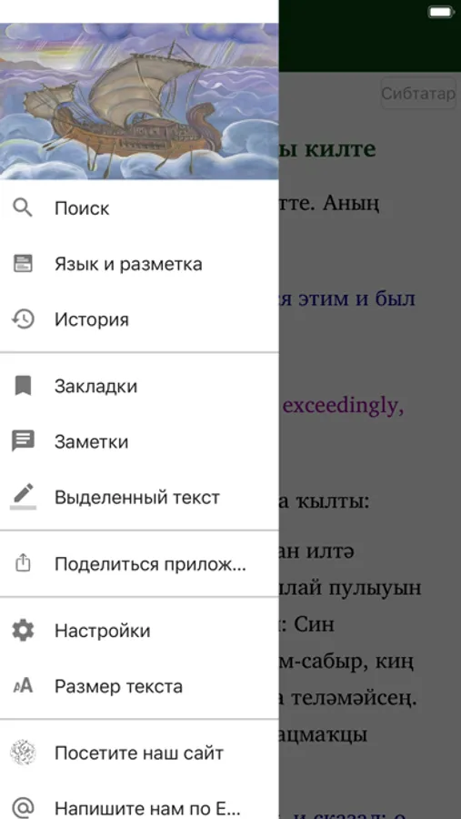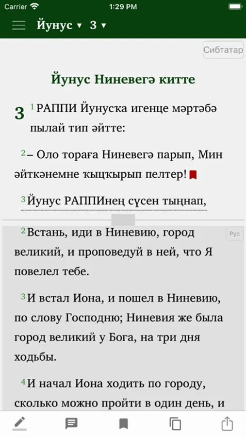 The app contains the translation into the Siberian Tatar language, and translations into Russian and English which can be displayed in parallel on demand. The app includes a search function and the users can highlight verses in different colors, place bookmarks and write notes. There is a reading history too. The app or its link in App Store can be shared with others.