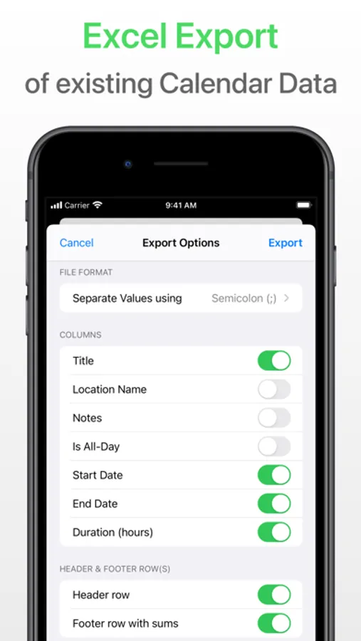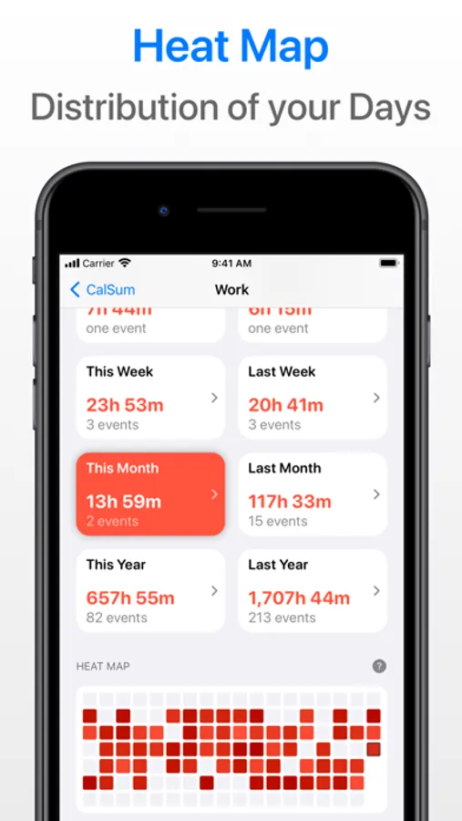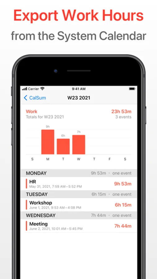 CalSum calculates summaries for all your calendar events you have already created in the Calendar App – simple and fast. You can see summaries for relative time frames like today, last week, this month, etc.