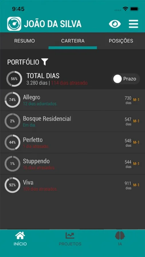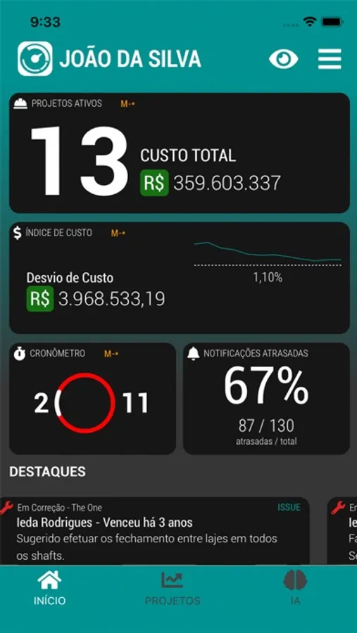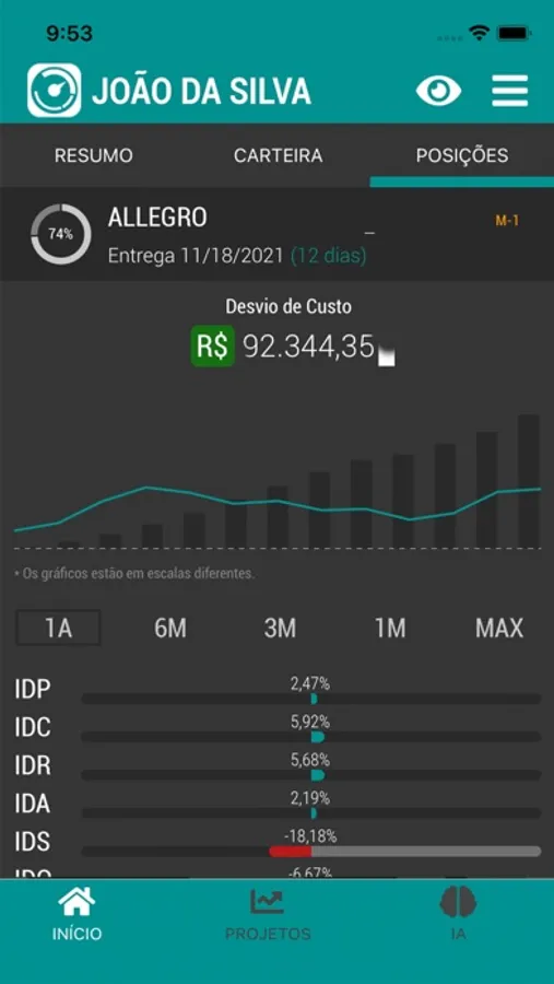 Siga 100% o plano de de Engenhara. Entenda a diferença do previsto para o realizado. Acompanhe em tempo real os riscos do seu projeto e receba alertas quando a complexidade do seu projeto estiver subindo, e portanto ameaçando todos os indicadores de prazo, custo, recursos, aquisições, qualidade e segurança.