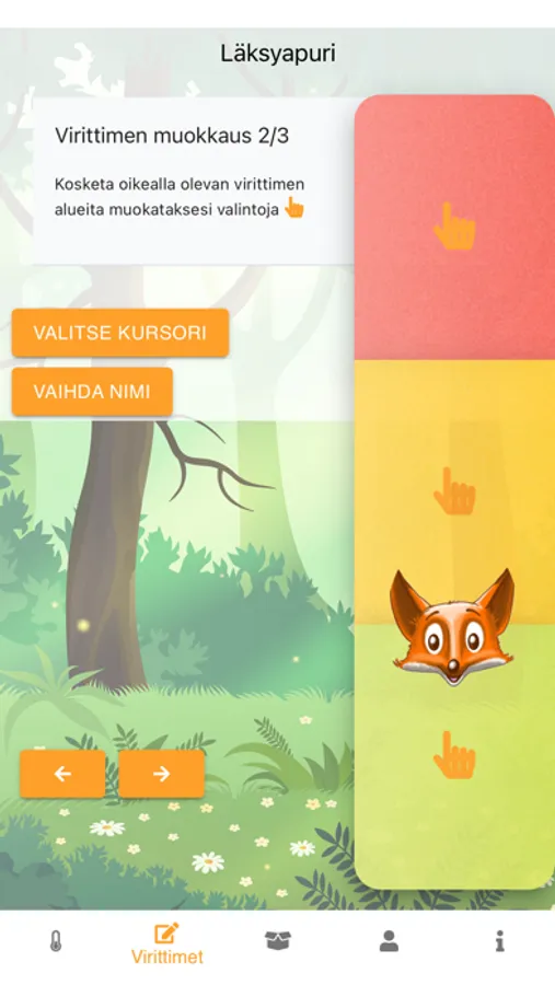 Toimi! sovelluksessa on valmis VireX viritin, joka opettaa vireystilan tunnistamista ja sen säätelyä. Voit arvioida virittimellä omaa vireystilaasi tässä hetkessä ja saada keinoja nostamaan tai tasaamaan vireystilaa. Toimi! Sovellus pitää sisällään myös ammattilaisten kehittämän keinopakin, josta löydät valmiita keinoja ja vinkkejä vireystilan ja itsesäätelyn tueksi eri hetkiin ja ympäristöihin. Sovelluksessa voit luoda myös omia virittimiä arjen eri tarpeisiin sekä luoda omia keinoja tukemaan osallistumista eri ympäristöissä. Sovelluksen kautta vireystilan tunnistamisen ja itsesäätelyn taitojen oppiminen tehdään hauskaksi ja motivoivaksi. Sovelluksessa osallistuminen ja osallistaminen mahdollistuu lapsen tasolla yksilölliset tarpeet huomioiden.