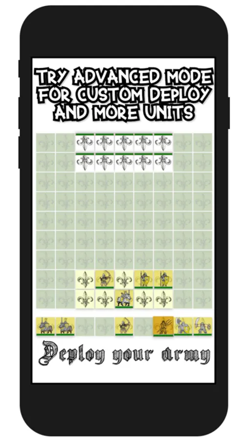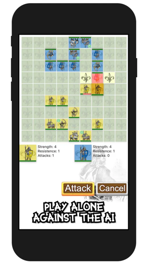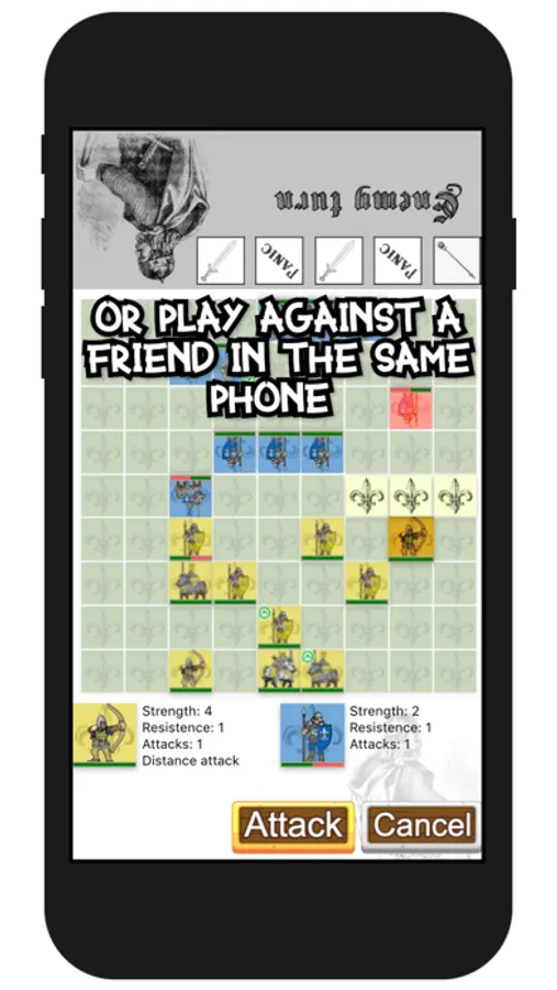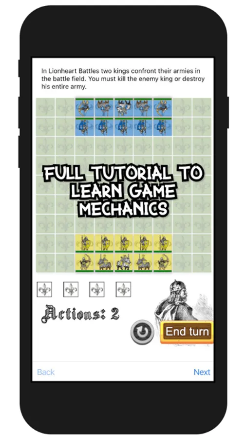 In Lionheart Battles two kings confront their armies in the battlefield in a chess-style game. The goal is simple, kill the enemy king or destroy his entire army. Play alone against the AI or with another player in the same phone.