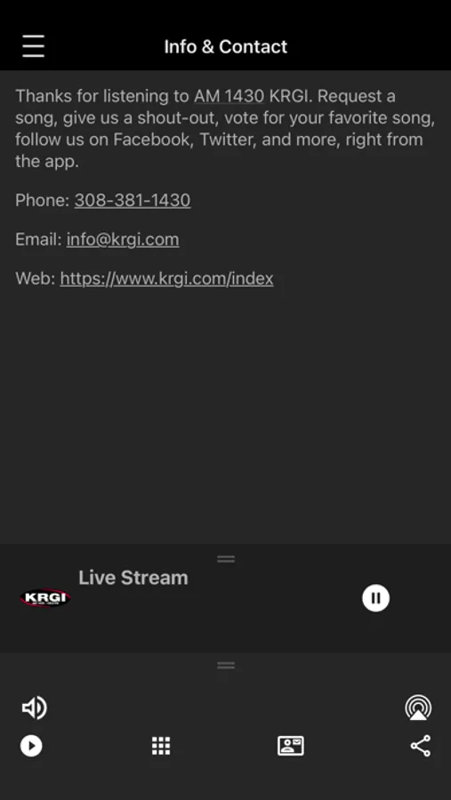 AM 1430 is your online connection to local news and events in Grand Island and the state of Nebraska. Plus, the top Talk shows and Ag Programs. Download the app and start listening to AM 1430 KRGI today. Tune in and listen all day, no matter where you are. Check out our App Features: Live Feed, Album artwork and song information of what's currently playing, Album artwork on the lock screen, Playlist History, 'Buy Song' for the current song that's playing, Connect with the stations by sending us a shout out or check out our Facebook and Twitter Feeds, Share with your friends and more. Download the app for free and start listening. Enjoy!