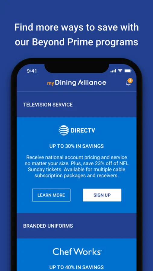 The Dining Alliance app provides easy access to our many Beyond Prime Programs, which offer a variety of ways to save money on all non-food aspects of your restaurant, including office supplies, pest control, recycling, credit card processing, DirecTV subscriptions, C02, and more. Sign up with One Touch in the app and add these valuable savings programs to your account.