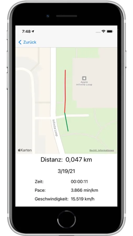Während du läufst, zeigt dir eine Karte deinen bisherigen Weg. Außerdem siehst du auf den ersten Blick deine Zeit, deine Pace, deine Geschwindigkeit und die bisherige Distanz!
