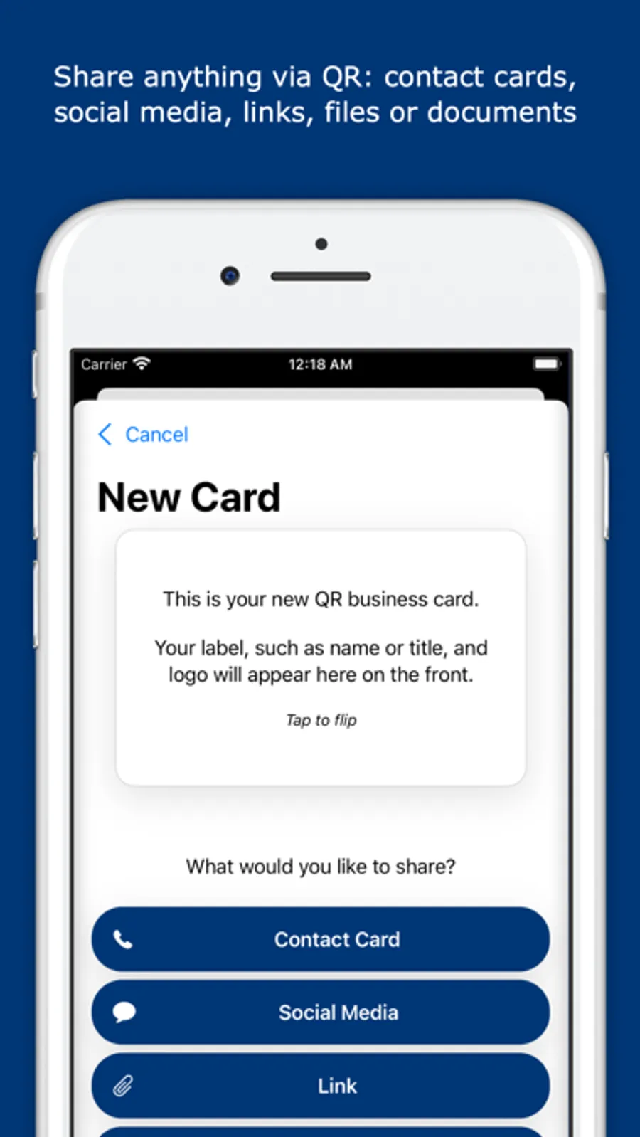 Simple. You tap on the "Add" button. Select the type of content you would like to be share (Social media, link, file or document, contact card). You then name your card and write on it any other details as you like (e.g. address, title, position). You can also use a special logo, or even customize the QR code style with an image from your photo library. You then hit "Submit" and then the card is added to your Omnicard homepage for use. You can add the card to our Apple Wallet as well!
