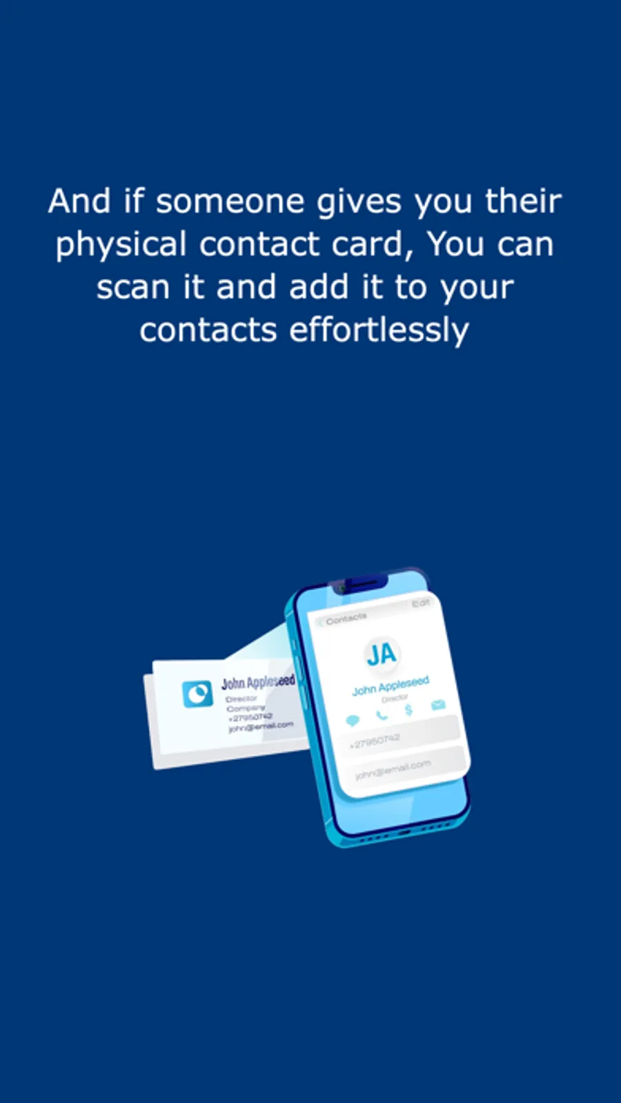 - Virtual Contact Cards (also known as: vCard, or VCF). Once scanned, the recipient can add you to their Contacts instantly without having to type in your number as in a traditional business card.
