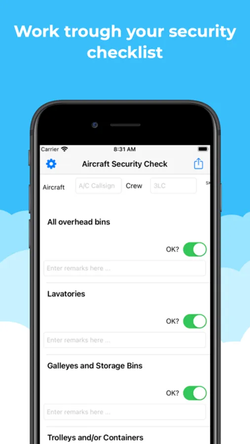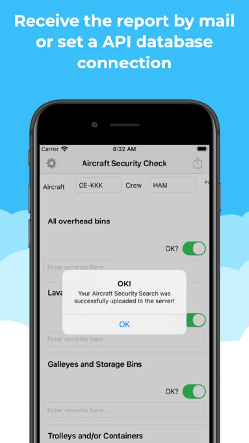 Comply to the operational control requirements of EASA and FAA and work trough your aircraft security checklist. Send the checklist control sheet by email to your email address or get an API Key and directly send the data into your database for statistical and organizational purposes.
