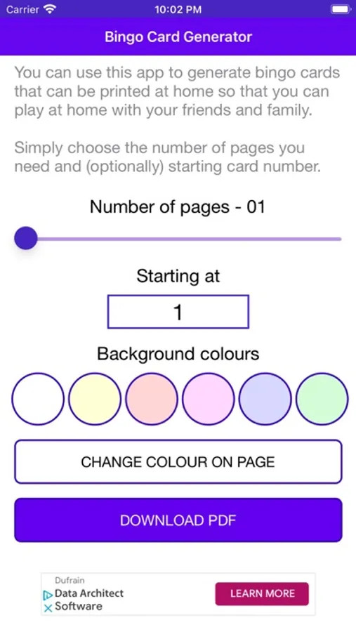 The app will produce books with six cards and 3 books to each A4 page. Choose a background colour for your books and optionally up to 20 pages (60 books). You can optionally specify a starting card number.