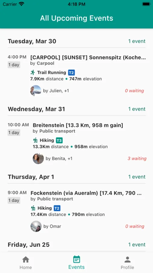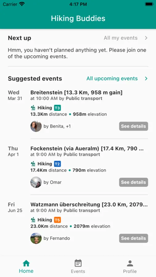 Hiking Buddies provides a platform to organize hiking activities. You can create a route and the platform estimates a difficulties based on various criteria. Anyone is free to organize/join the events. You can track your fitness in the app.