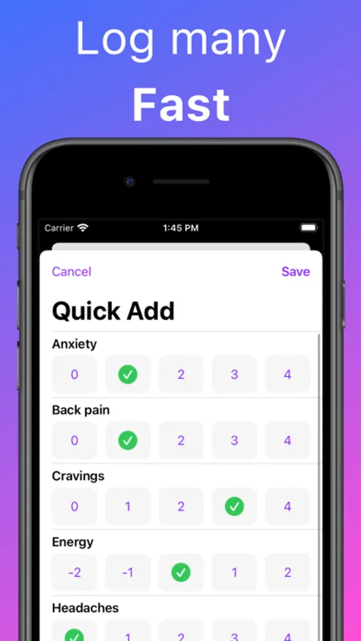 Quick Log lets you log entries for everything you’re tracking, fast. Don’t be burdened by cumbersome apps that require a million details each entry.