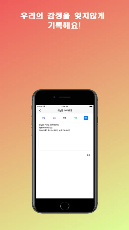 - 우울, 슬픔, 보통, 기쁨, 행복 다섯가지 감정으로 하루를 기록해요