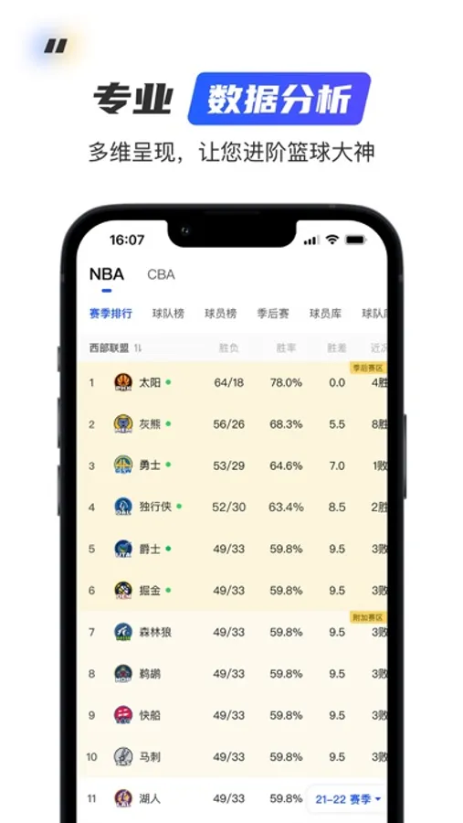 2、数据中心主要提供NBA东西球队和CBA球队的排行榜,球员的得分榜、助攻榜、盖帽榜、抢断榜、篮板榜、失误等数据排行