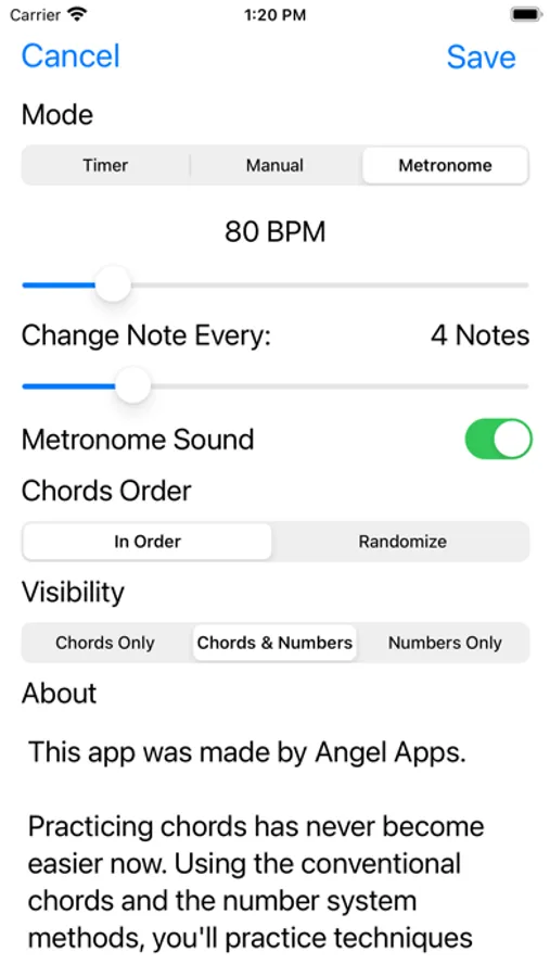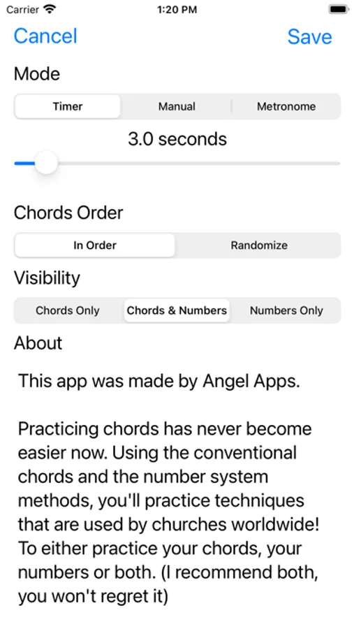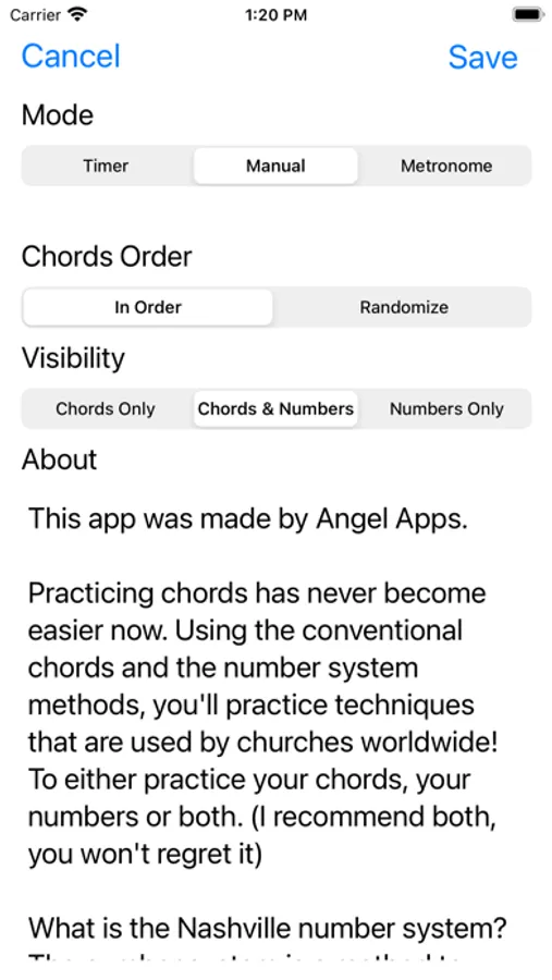 This app will help you practice your chords and numbers with ease! It's easy and intuitive to use while giving you the ability to set a timer to automatically change the chords. this app also includes number from the Nashville Number System. It will guide you to practice and memorize the chords the key for the numbers and will be useful in the future! A very useful skillset to have! Use the integrated metronome to set your desired BPM. Voice dictation coming soon.