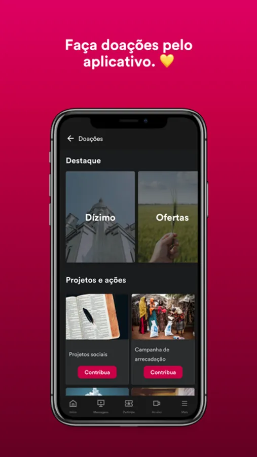 - Doe ou contribua com a igreja diretamente pelo aplicativo através de cartão de crédito ou boleto.