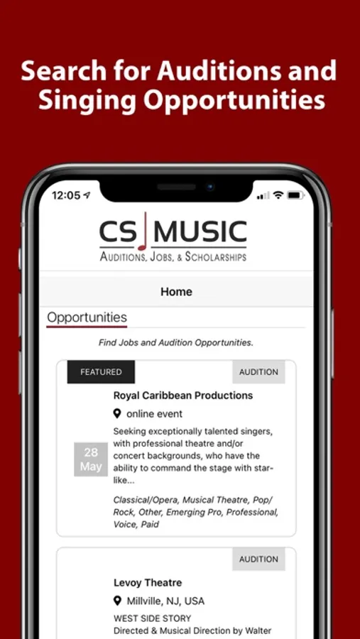 CS Music is the platform to connect Music students and emerging professionals to universities, training programs, and companies. Thousands of singers and pianists use CS Music and Classical Singer to find auditions, jobs, and scholarships. Hundreds of colleges, opera houses, musical theatre agencies, managers, and industry professionals look to CS Music for upcoming talent.