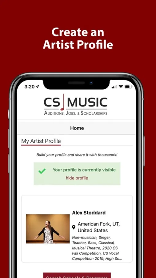 After users create an Artist Profile, they have the option to “publish my profile”. This makes the profile live on the App and on the CSmusic.net website. Once it is published, organizations can view the profile and can email the user directly.