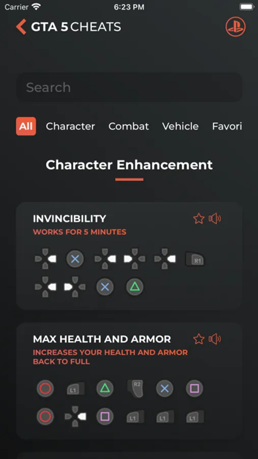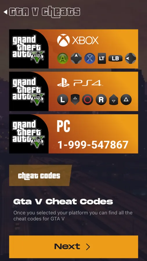 Cheats for Grand Theft Auto V for XBOX, PlayStation,PC, all in one app.