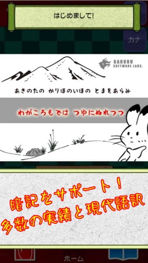 ソーシャルアプリ風に軽い気持ちではじめて百人一首をおぼえ、地獄のような厳しい敵とクエストを生き抜くことで全100首のうち約50%の歌を徹底的に記憶する無料アプリです。「あれ?じゃあ残りの50%は?」残りの歌人50人を収録した「葵(有料版)」をご用意しております。最初の50首を極めたあとはぜひ。