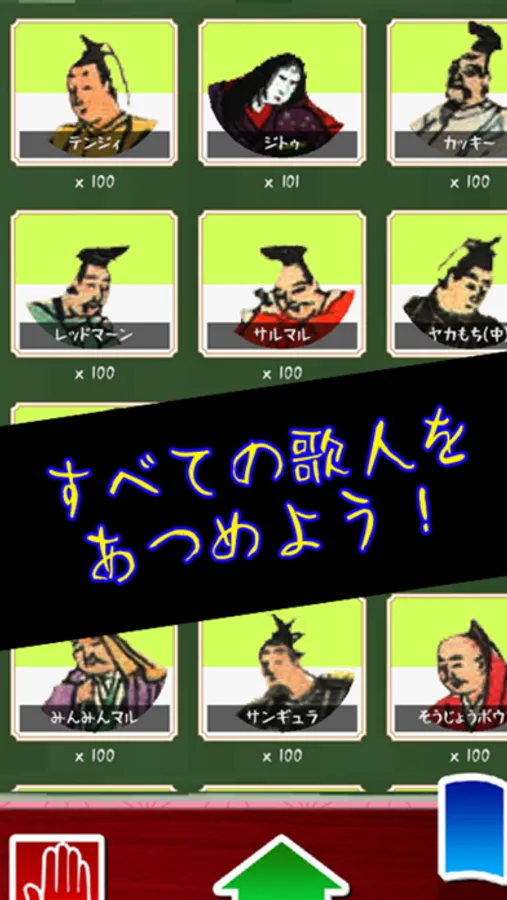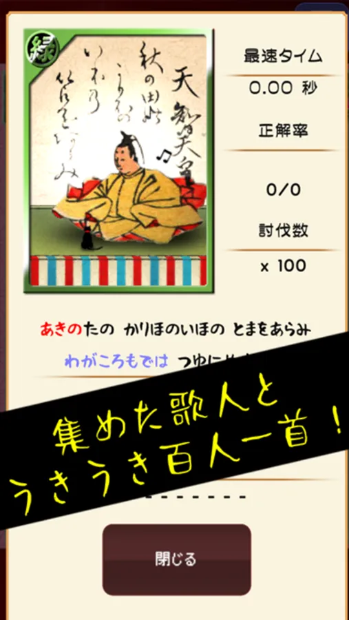 ホンモノの歌人のグラフィックが現代技術でいきいき百人一首!音楽を楽しむ歌人や眼鏡を探す歌人など、捕まえた歌人と24時間たのしいかるたライフ。夜21:00以降はみんな寝てしまうので早めに楽しんでね。しらなかった歌人の鼓動が、魅力がよみがえる!仲間を集めて選者フジワラ・ジ・アンダーテイカーの新しい和歌集「一人百首」構想を打ち砕け!