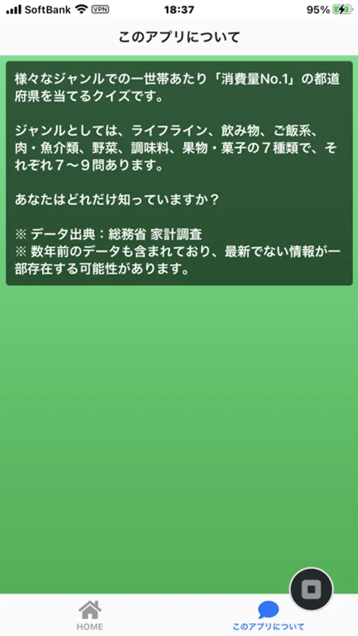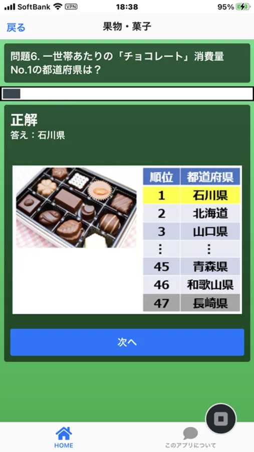 ジャンルとしては、ライフライン、飲み物、ご飯系、肉・魚介類、野菜、調味料、果物・菓子の7種類あり、それぞれのジャンルで7~9の質問が出てきます。これらの質問に対して、候補の都道府県として4つの選択肢が表示されますので、正解と思うものをタップします。そうすると、正解か誤りかの判定とともに、該当対象物の写真と都道府県ランキング(1~3位、45~47位)が表示されます。消費量No.1の都道府県は、あなたにとって意外なものがあるに違いありません。あなたはどれだけ知っているでしょうか?