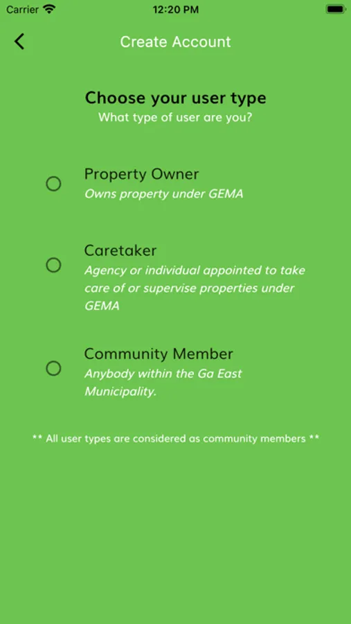 The GEMA Property App has three types of users: Property Owner, Property Overseer and Community Member. A Property Owner owns one or more real estate properties in the area administered by the Ga East Municipal Assembly (GEMA).