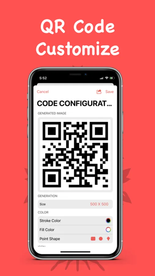 - Customise QR code with icon, point shape, background colour and images