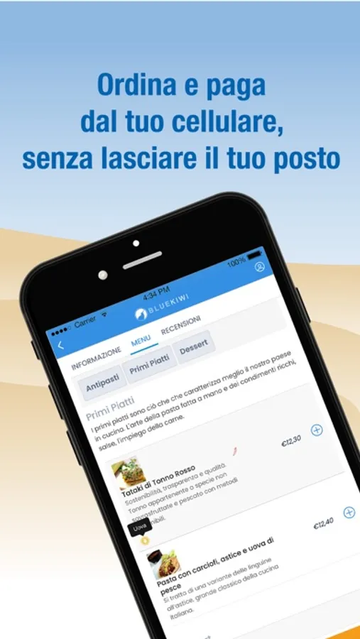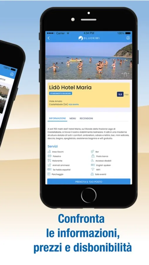 Con BLUEKIWI i clienti possono prenotare un tavolo o un ombrellone sul tuo Stabilimento Balneare o Ristorante, consultare il menu digitale o la lista dei servizi offerti e prenotarli direttamente dal tavolo o dal lettino in spiaggia.