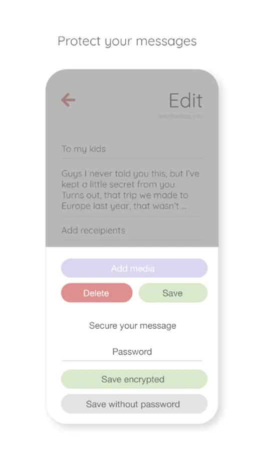 First you write the message, and add one or more contacts that you want the message to be sent to. Once a month, we will reach out to you via email or notifications. As long as you open them, your messages will stay put in your account. Once you pass away, you will probably stop checking your emails... After you miss 6 emails in a row, we send everything on your behalf.