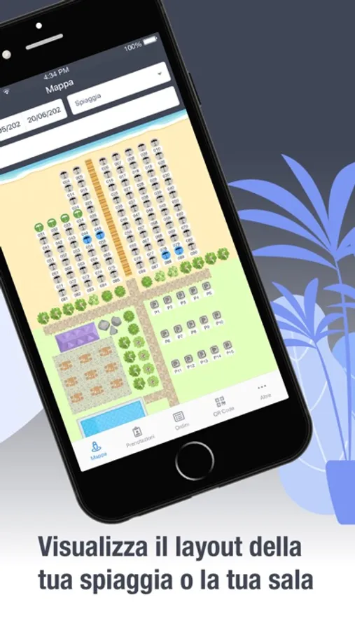 Dalla Mappa potrai visualizzare il layout della tua spiaggia o la tua sala e controllare la disponibilità dei tavoli o degli ombrelloni.