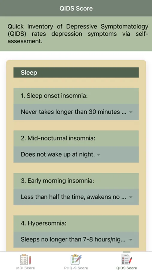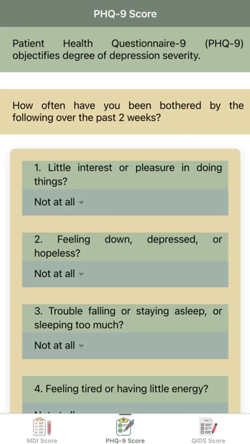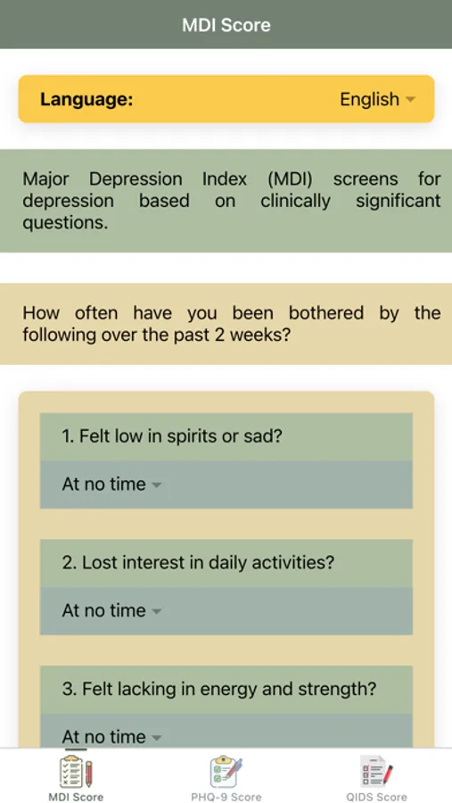 “Pocket Depression Test - Clinical Depression Symptoms” is an app designed for screening and diagnosis of depression based on several validated tests or questions. Depression is a common and serious medical illness that negatively affects how you feel, the way you think, and how you act. It may be described as feelings of sadness, loss, or anger. Early screening of depression and classification of its severity are helpful in determining appropriate action to help. people with depression. In “Pocket Depression Test - Clinical Depression Symptoms” app, there are three main tests available, namely: (a) Major Depression Index (MDI); (b) Patient Health Questionnaire-9 (PHQ-9); (c) Quick Inventory of Depressive Symptomatology (QIDS). These are the most commonly used test by medical practitioner to screen and classify degree of depression severity.