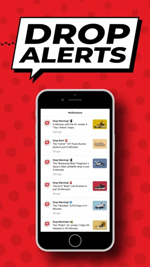 NICE KICKS sends push notifications to users with direct links to the hottest drops as soon as they become available. Add shoes to your radar and get notified when they release or go on sale.