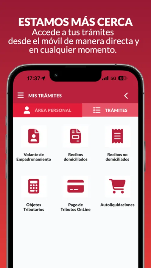 Además, puedes acceder a tus trámites desde tu teléfono móvil de manera directa y en cualquier momento (obtención volante de empadronamiento, recibos, pago de tributos, autoliquidaciones...), así como a tu área personal (notificaciones, expedientes, calendario fiscal, oferta pública de empleo...).