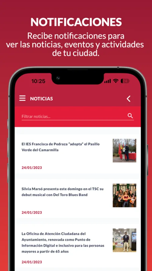 Recibe notificaciones de las noticias de tu ciudad y consulta los próximos eventos y actividades. Podrás acceder a noticias, avisos y publicaciones en tiempo real. También podrás consultar la agenda cultural y de ocio, así como acceder a la revista municipal.