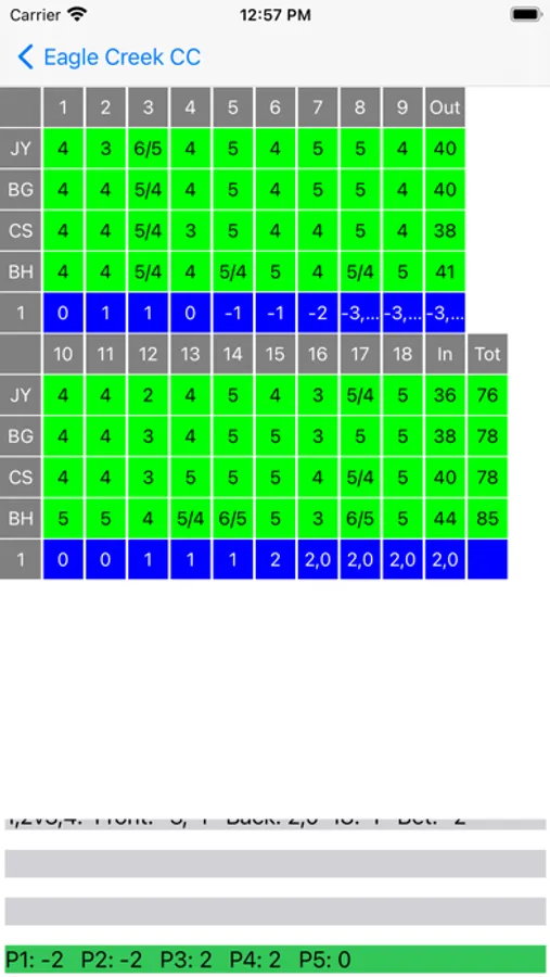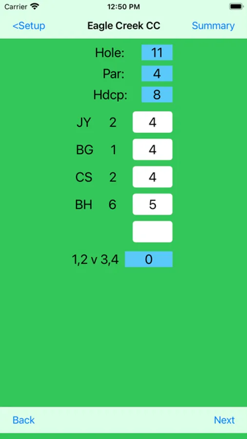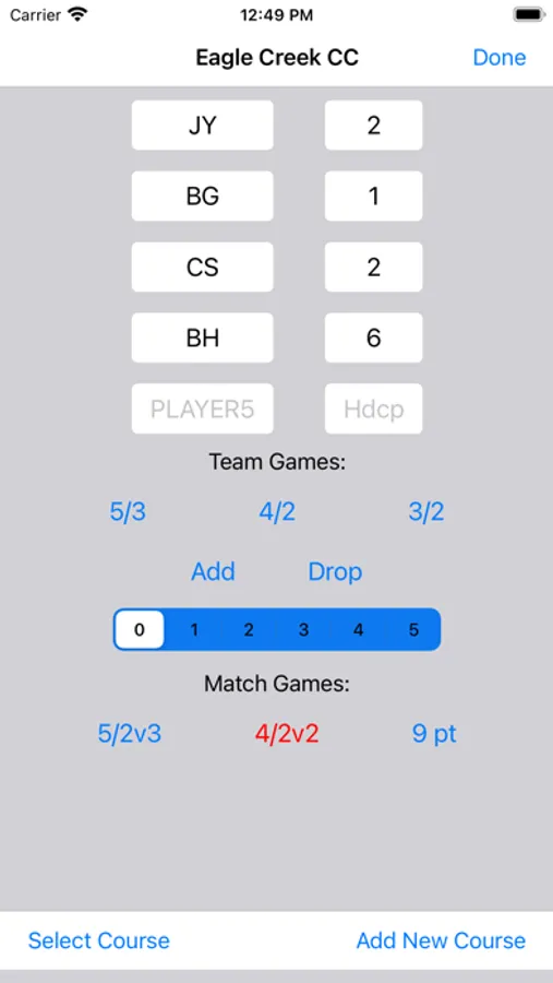 Load course name, par and handicap information. Setup games for up to 5 players. Team games include 5 players/3 scores; 4 players/2 scores; 3players/2 scores. Automatically adjusts team scores for adding or dropping a player. Match games for 4 players/ 2 vs 2; 5 player "swing game" for 2 players vs the combination of 3 other players. Also, a 9 point game for 3 players.