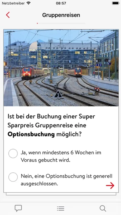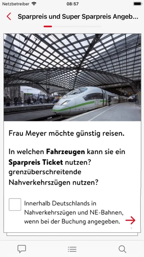 With Deutsche Bahn's learning app, you decide when, where and for how long you want to learn, for example, information about offers and fare conditions. With digital flashcards and in small learning steps, you build up extensive knowledge step by step: entertaining, memorable, sustainable.