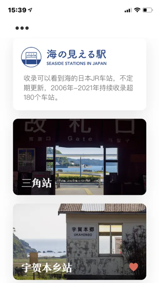 这是一本日本旅行画册App,从2006年开始,到2021年间持续收录180+能看见海的日本车站,不定期更新。