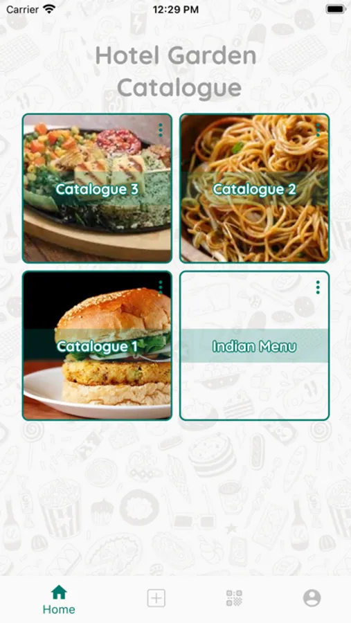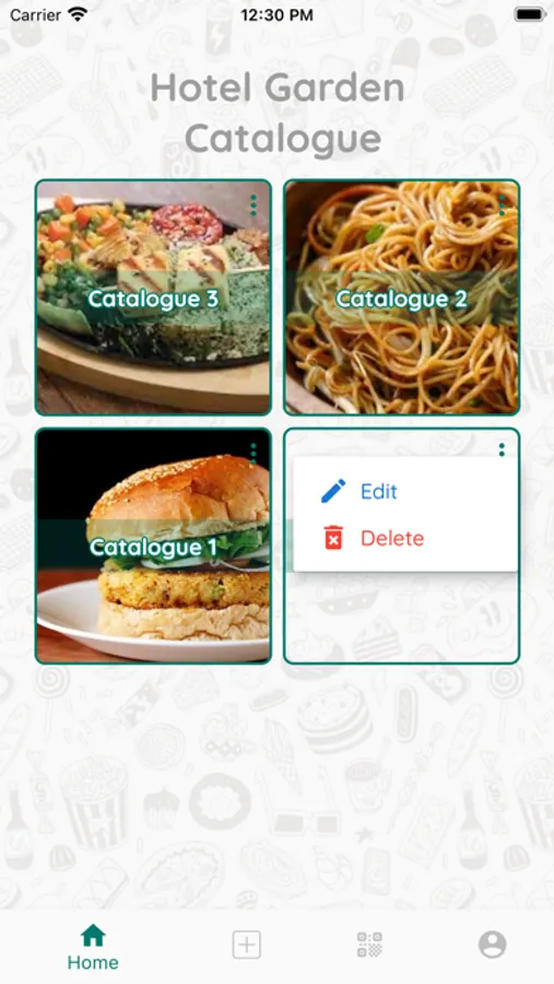 2. On Home(first bottom navigation) tab you can see all your catalogue/menu grid, also can Edit or Delete particular catalogue/menu by just tapping vertical snap button(three vertical dots) on top-right of each catalogue/menu grid item