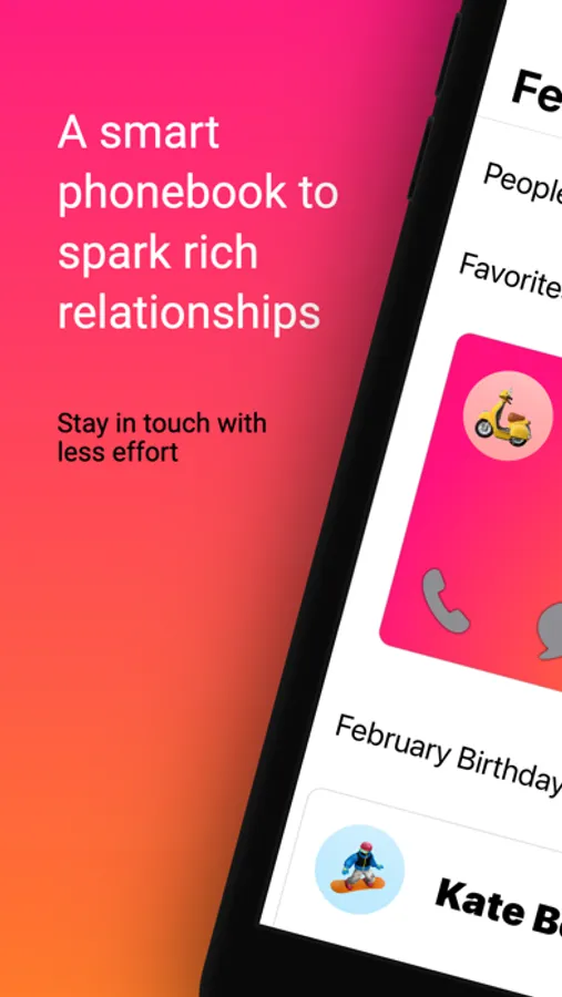 Sparkbook intelligently focuses you on people you're losing touch with, a few contacts at a time. It lowers the barrier for you to stay in touch by shuffling your favorites and giving you shortcuts to call or text with pre-written messages. Never say “I’m so bad at keeping in touch” again. Sparkbook is for people who need a way to feel like no time has passed since you last spoke to somebody.