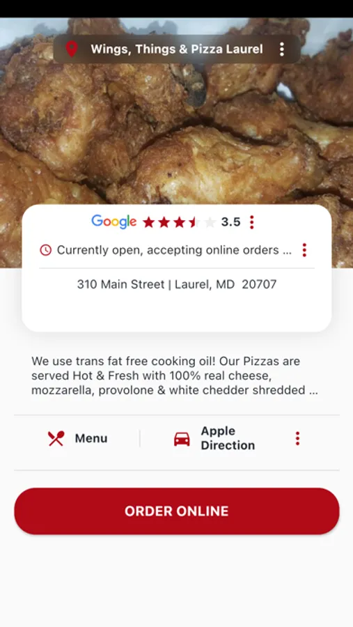 Wings Things & Pizza restaurant app has many different functions. It contains an online ordering link, restaurant images, address, and driving directions, store hours, menus, and many other great features.