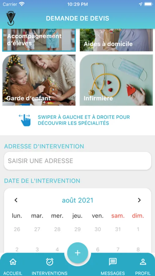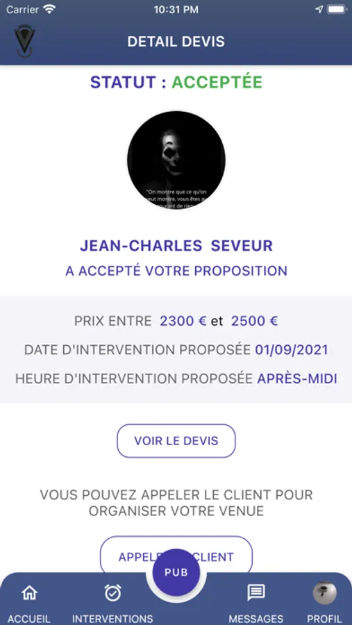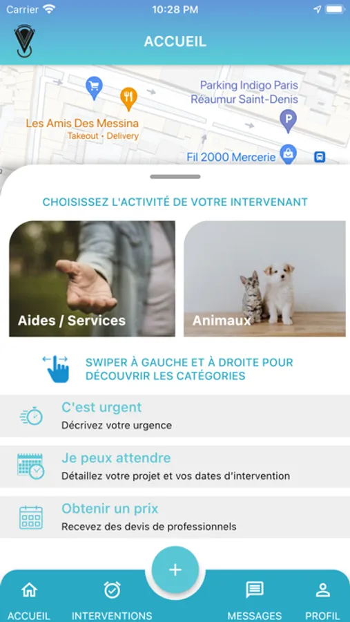 Decouvrez l'application n°1 pour les professionnels et les particuliers recherchant des prestations . 1: Pour les particuliers vous pouvez rechercher et trouver n'importe quel services geolocaliser , demander une intervention programmée , immediate ou un devis. 2 : pour les professionnels l'application permet de presenter vos services , en fonction de vos deplacements et lieux goegraphique d'avoir des demandes de client interressés par vos services en temps réel et de les planifier , vous pouvez egalement envoyer directement via l'application vos devis , repondre sur vos disponibilités d'intervention et ainsi completer vos agenda . vous pouvez selon l'abonnement choisis piloter plusieurs employés 5 ou 10 maximum