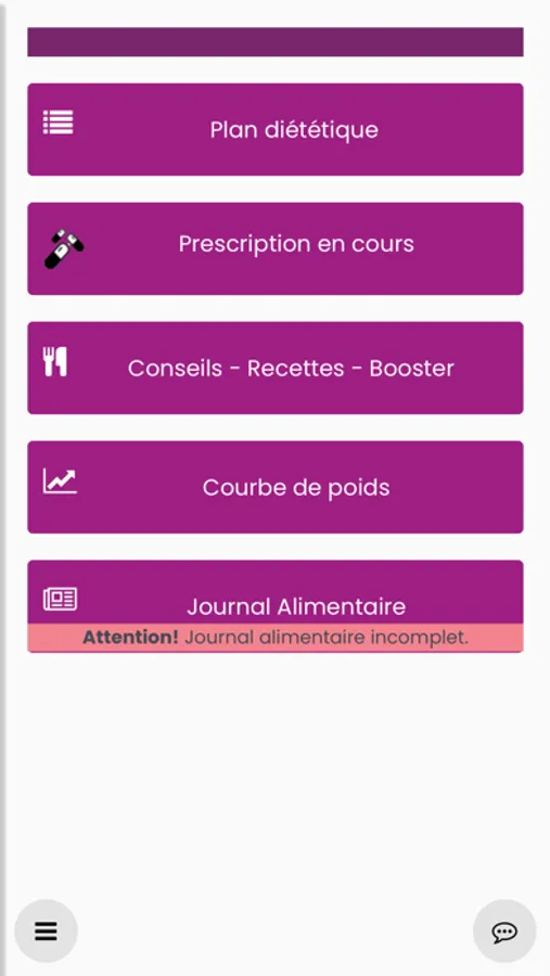 Vous retrouverez votre prescription, votre plan alimentaire établi par votre coach-diététicienne ainsi que votre courbe de poids.