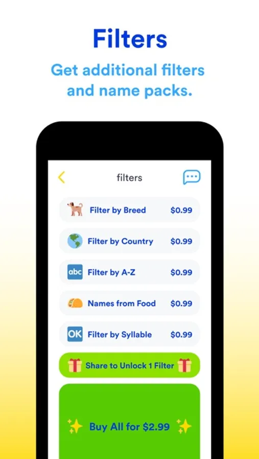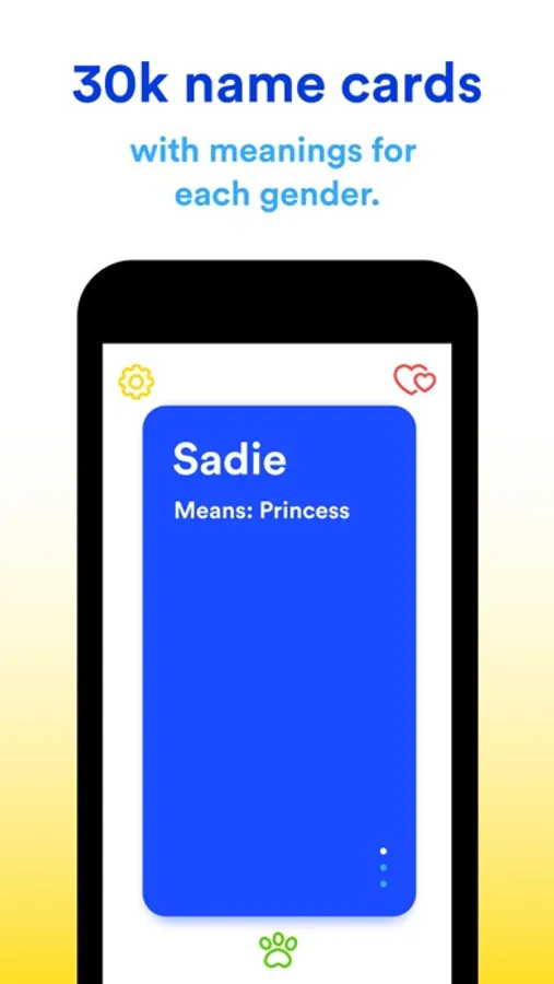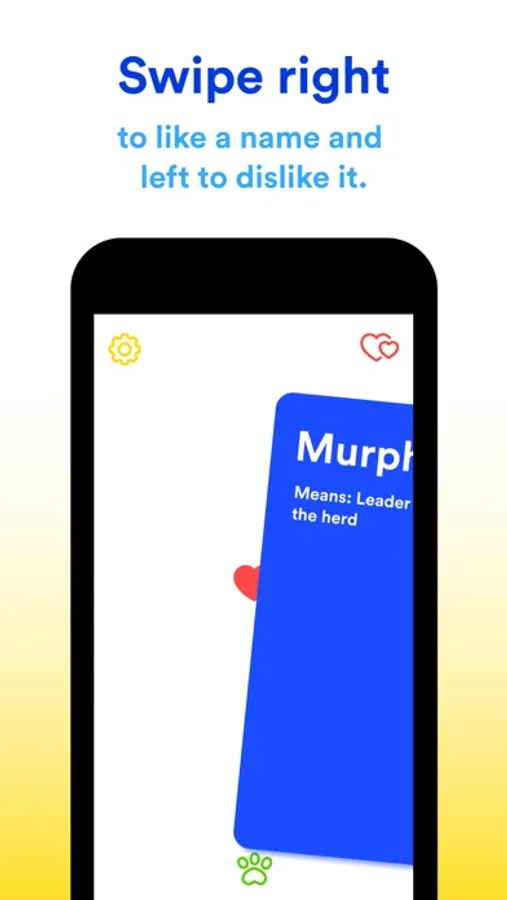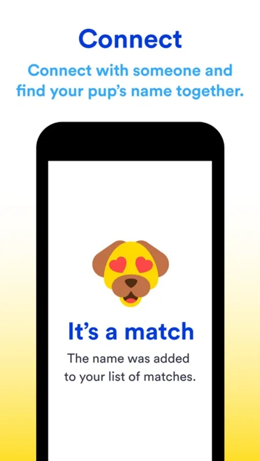 Connect with your partner and swipe through dog name cards together. If you both like the same name, it's a match and is added to your favorites list, so you'll never forget it. One name will last a lifetime.