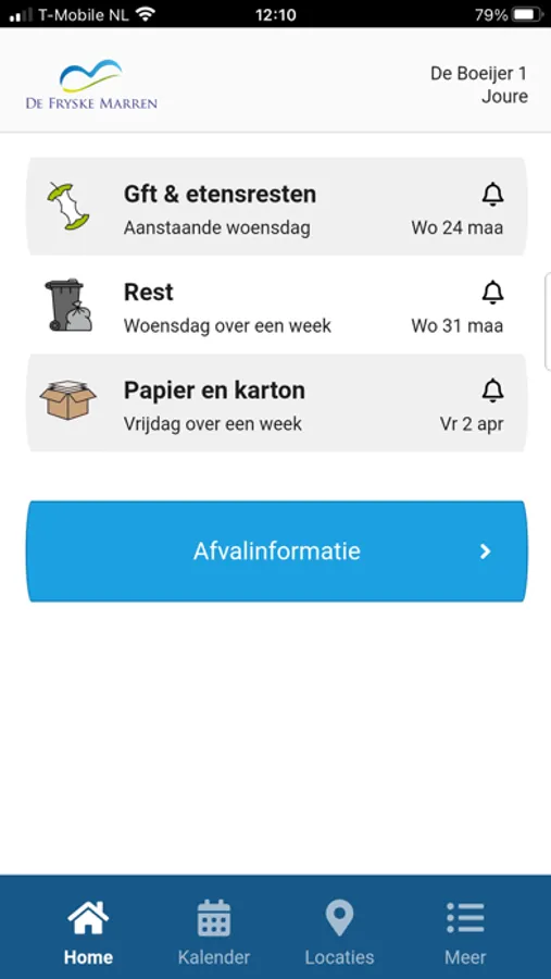 Woont u in de gemeente De Fryske Marren? Voer dan uw postcode en huisnummer in. Vervolgens ziet u in de digitale afvalkalender alle informatie over het scheiden van het huishoudelijk afval en het aanbieden van huishoudelijk afval. U kunt tevens een push-bericht ontvangen wanneer het afval aan de straat gezet kan worden.