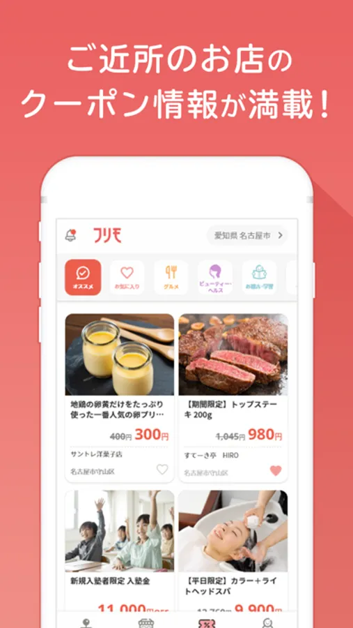 フリモは地元でお馴染みの飲食店、ヘアサロン、エステ、習い事で使えるお得な割引クーポンや、人生の節目を迎える方に嬉しい住宅、車、ブライダルといった商品やサービスを提供する企業やお店で使えるクーポンが探して使えるアプリです。