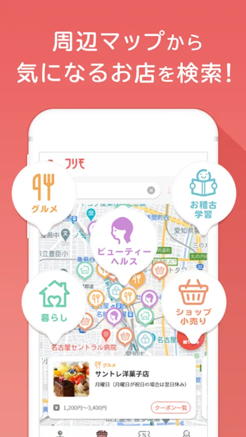 お腹が空いたとき、キレイになりたいとき、買い物したいとき、フリモアプリを持って出かけよう!