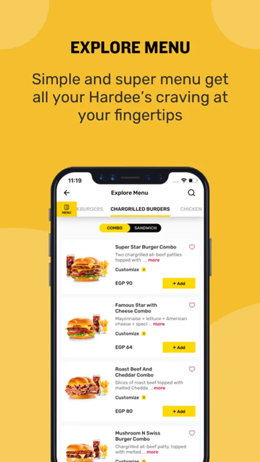 Hardee’s Egypt food app is now available on your fingertips. Ordering food online has never been this exciting. Indulge in our 100% Angus beef thickburger, chargrilled burgers, beef sandwiches & more from the comfort of your home. Avail tempting deals and offers now at the Hardee's restaurant near you.
