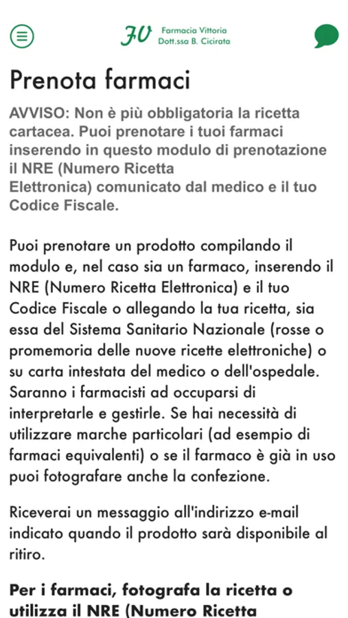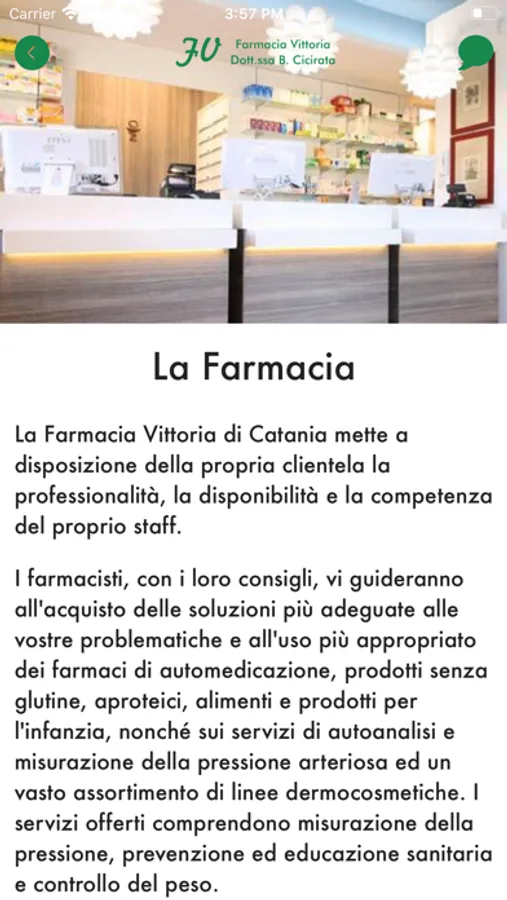 L'App della Farmacia Vittoria Cicirata di Catania ti permette di avere il tuo farmacista di fiducia sempre a portata di mano con consigli, informazioni, prenotazioni, ordini, richieste di prodotti e servizi in farmacia.