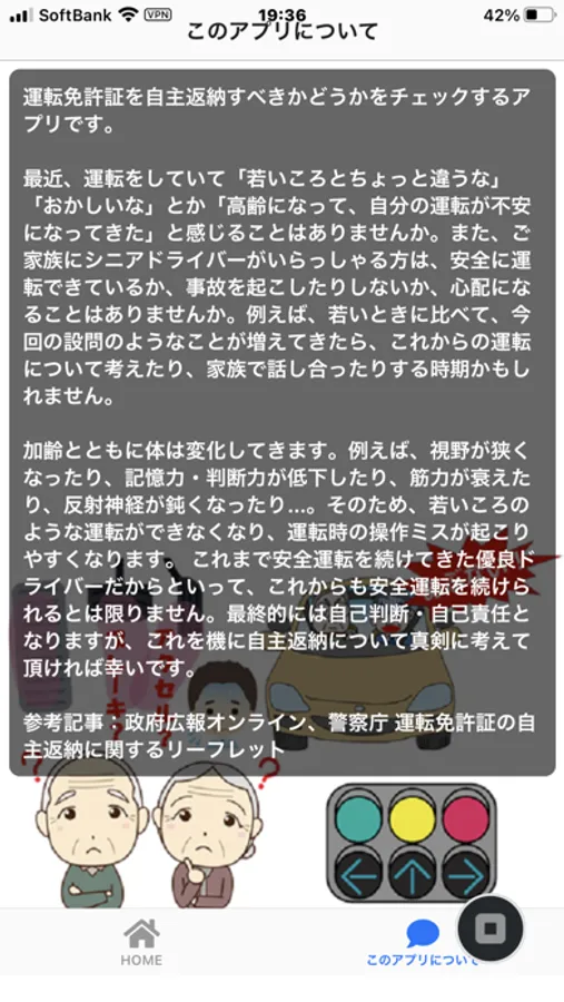 最近、運転をしていて「若いころとちょっと違うな」「おかしいな」とか「高齢になって、自分の運転が不安になってきた」と感じることはありませんか。また、ご家族にシニアドライバーがいらっしゃる方は、安全に運転できているか、事故を起こしたりしないか、心配になることはありませんか。例えば、若いときに比べて、このアプリの設問のようなことが増えてきたら、これからの運転について考えたり、家族で話し合ったりする時期かもしれません。